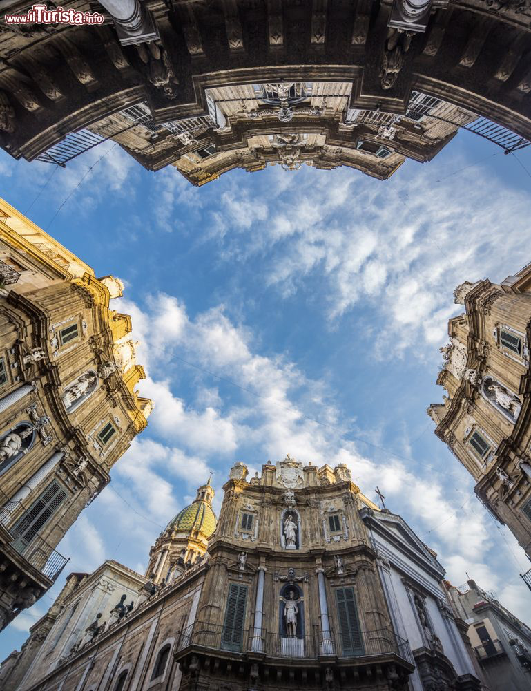 Wenn wir das Hotel verlassen, gehen wir links in die Via Maqueda und Sie werden erstaunt sein, wie viele spanische, katalanische, portugiesische, französische und englische Referenzen Sie in Palermo finden. Bald sind wir vom Ziel unserer Reiseroute geblendet: dem „ Quattro Canti“ " gebildet durch die Kreuzung der beiden wichtigsten Straßen der Stadt: Corso Vittorio Emanuele und Via Maqueda. Jeder Kanton repräsentiert den Bezirk dahinter und jeder der vier Kantone hat seine eigene Schutzpatronin: Santa Ninfa, Santa Cristina, Santa Oliva und Santa Agata, deren Statuen in jedem Kanton aufgestellt sind.